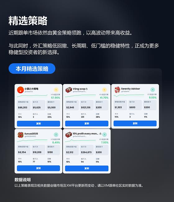 Die Strategie dieses Monats zeigt die zwei Hauptlinien „Gold weist den Weg und Devisen entstehen“: Goldstrategie ist immer noch im Fokus hoher Renditen, wobei das monatliche Einkommen der Top-Strategiemanager 50 % übersteigt; Die Devisenstrategie zieht aufgrund ihrer relativ stabilen und niedrigen Schwellenwerte allmählich Investoren zum Beitritt an.