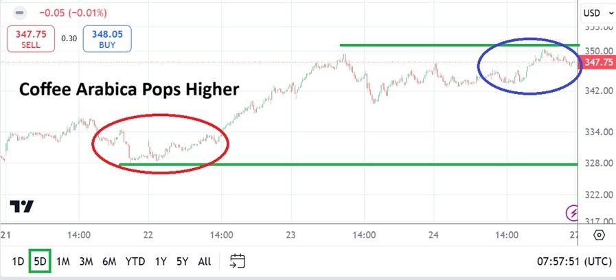 Speculators who were counting on their downward perspectives in Coffee Arabica to finally pay off, instead were treated to another pop higher in the price of the xm217.commodity. Not only did the value of Coffee Arabica escalate, but it broke record highs and the 350.00 mark saw sustained trading above until seeing a slight reversal took place on Friday and a close around the 347.75 ratio happened.