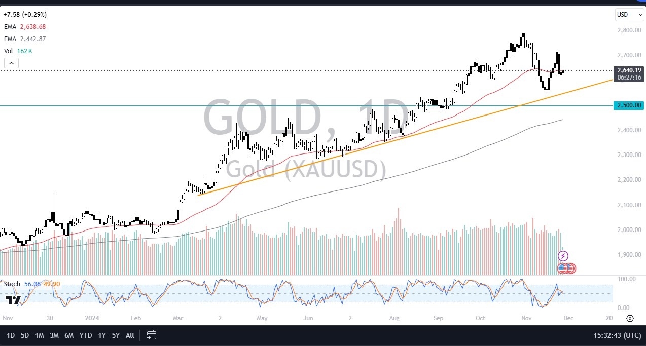 The technical analysis for this gold market is still strong, due to the fact that the trend line underneath is still holding, and of course we are trying to break above the 50 Day EMA. If we can rally from here, then it’s likely that the market could go looking to the $2700 level, which is where we had previously seen selling pressure. If we can break above there, then the market is likely to go looking to the $2800 level.