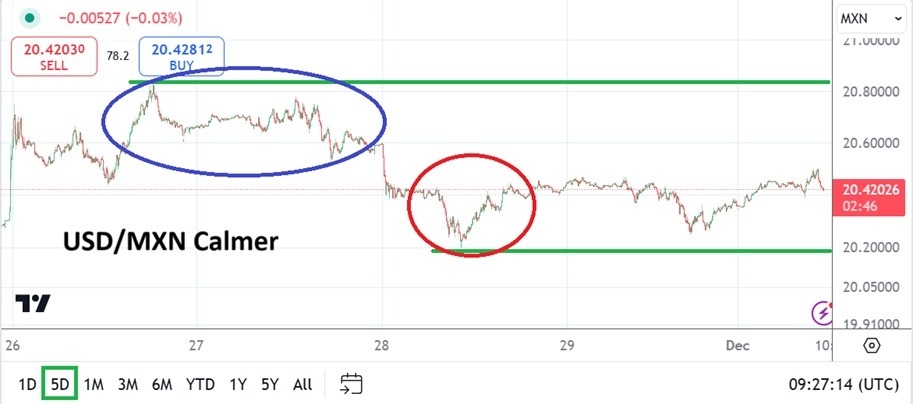After trading around the 20.73000 level into Wednesday of last week, the USD/MXN has begun to exhibit calmer trading sentiment among financial institutions, but the currency pair remains within higher elements still even as it trades lower.