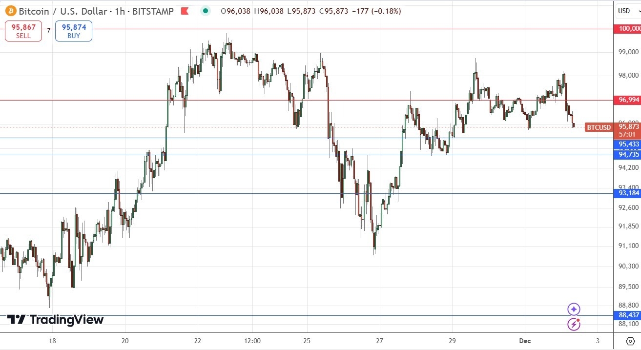 - Shor entry after a bearish price action reversal on the H1 timeframe following the next touch of $96,994 or $100,000.