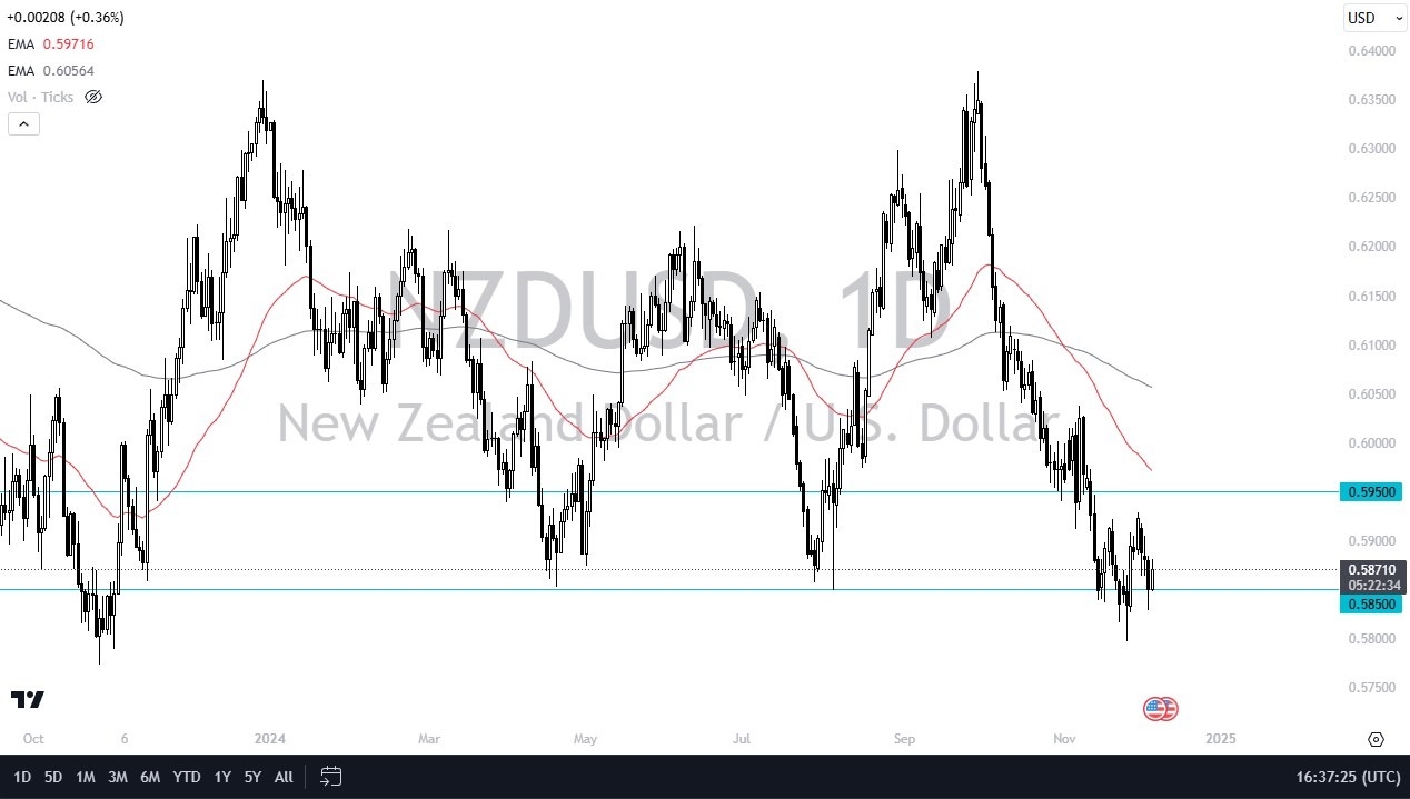 That being said, I think we also have a situation where a lot of traders are looking at this through the process of whether or not we are actually forming a bottom. If we were to break down below the 0.58 level though, I think the bottom falls out and we could see a lot of US dollar strength across the board. Keep in mind that the Friday session features the non-farm payroll announcement and that will have a major influence on the greenback itself. With this being said I think you have a scenario where the 0.5950 level above is your ceiling and it is going to continue to see that area as trouble. If we can break above there then I think the New Zealand dollar truly takes off.