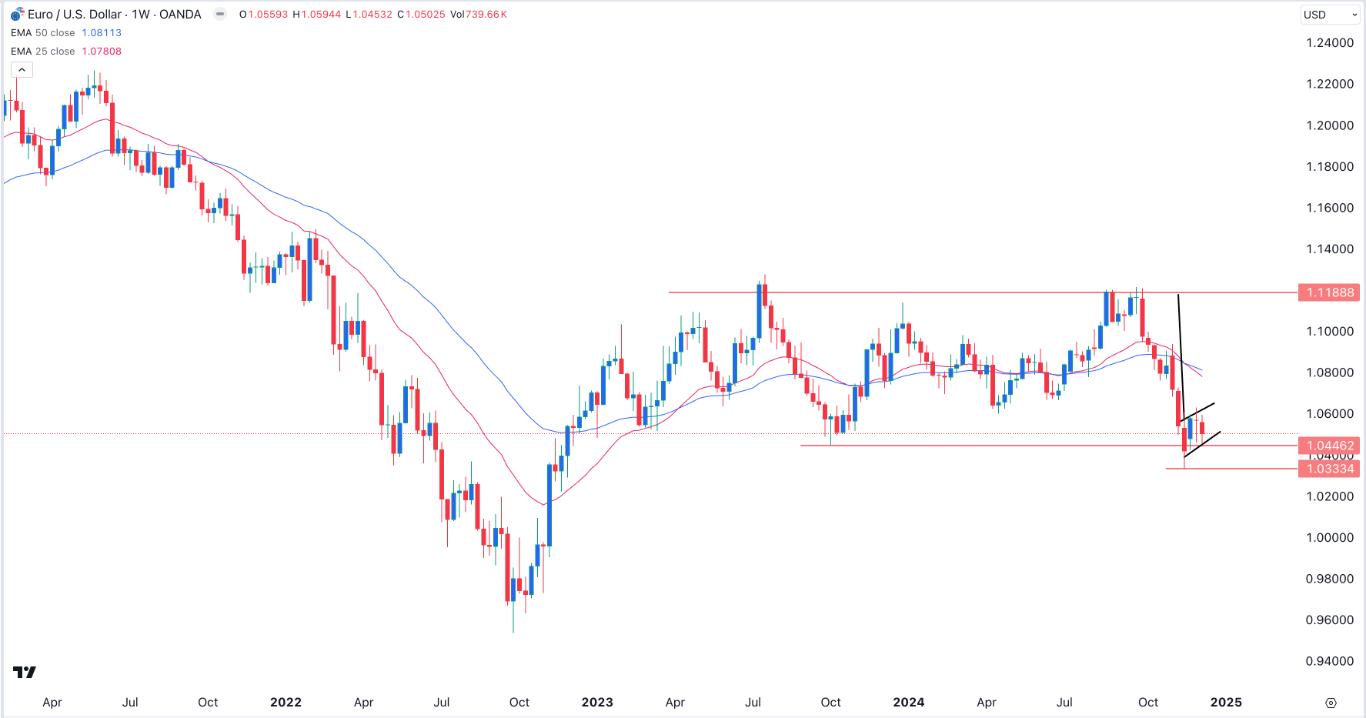 The EUR/USD notched a second weekly decline in a row after the European Central Bank (ECB) slashed interest rates and the US published the November inflation data on Wednesday. The pair ended the week at 1.0502, 6.2% below the year-to-date high of 1.1215.