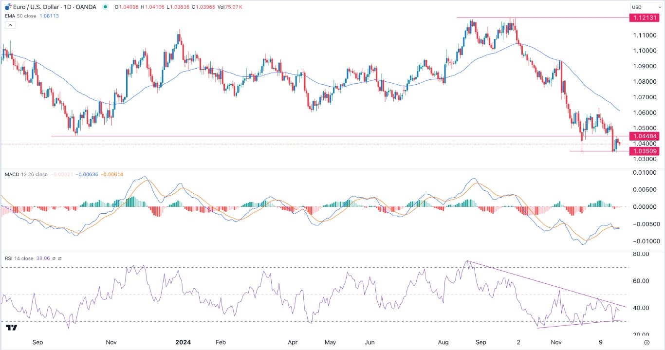 The EUR/USD pair has been in a strong downtrend as the US dollar index (DXY) has surged to the highest level since 2022. It has dropped from 1.1213 in September to 1.0400, lower than the key support at 1.0450, its lowest point in September.