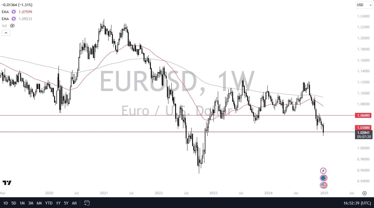 The euro initially tried to rally during the week but then fell apart as we broke below the 1.03 level. The 1.03 level of course is a large, round, psychologically significant figure, and an area that previously had been massive support. The fact that we have pierced that level suggests to me that we are going to continue going lower. All things being equal, I like the idea of feeding short-term rallies that show signs of exhaustion, and I think the euro is eventually going to go looking to the parity level.