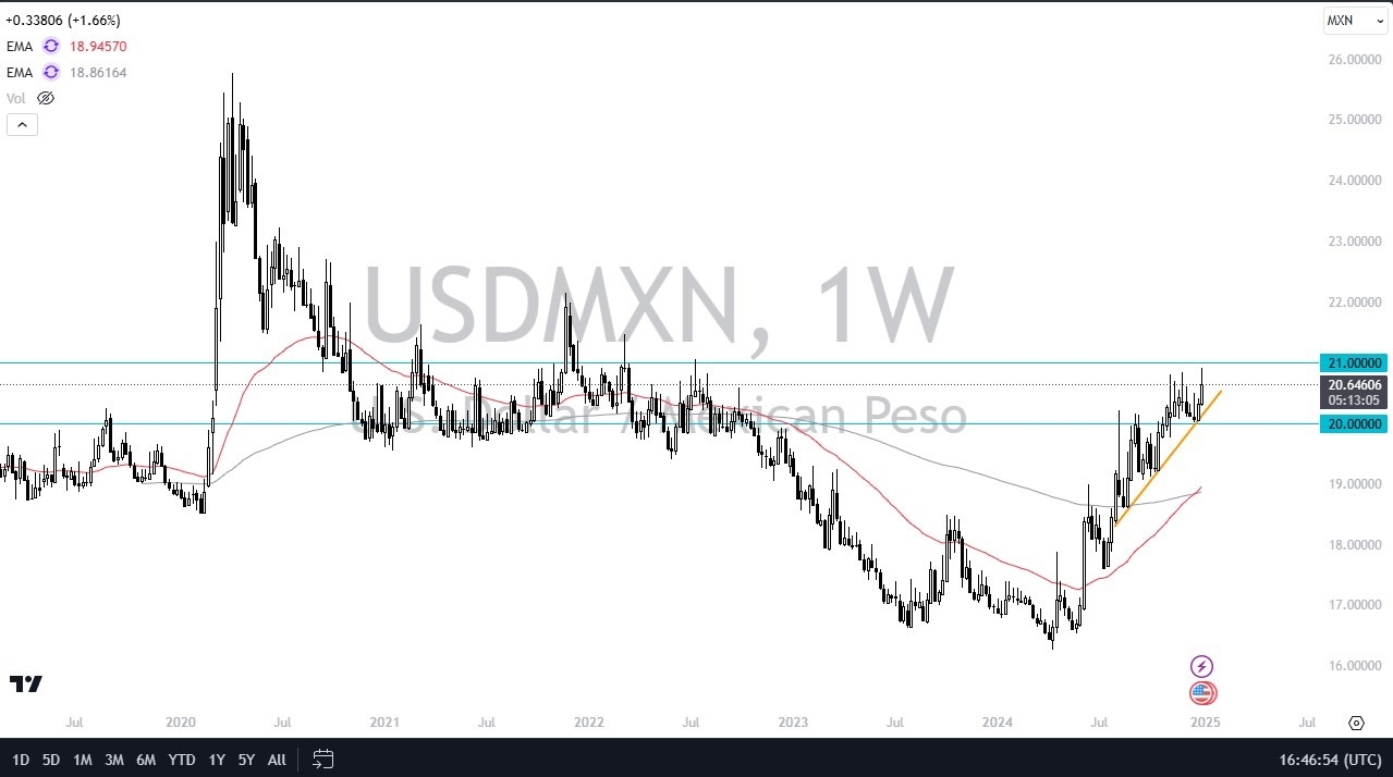 The US dollar has rallied rather significantly against the Mexican peso during the previous week but has given back some of the gains. All things being equal, think we continue to focus significantly on the 21 MXN level, which is an area that if we were to break above, it could open up a huge move higher. I think at this point, it’s very likely that we will continue to go back and forth, with more or less a “buy on the dip” type of attitude. If we break down below the 20 MXN level, then we could see more of a deeper correction.