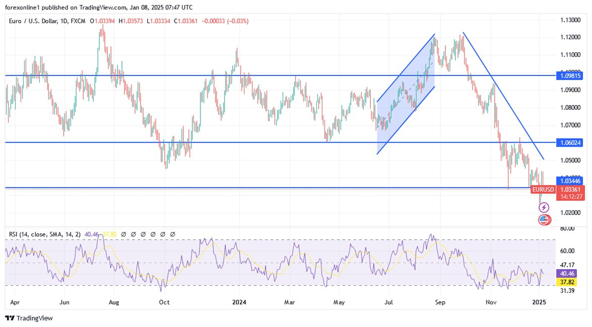 - During yesterday's trading session, the EUR/USD pair attempted to rebound upwards, but its gains did not exceed the 1.0435 level before settling back down around 1.0335 at the time of writing this analysis.