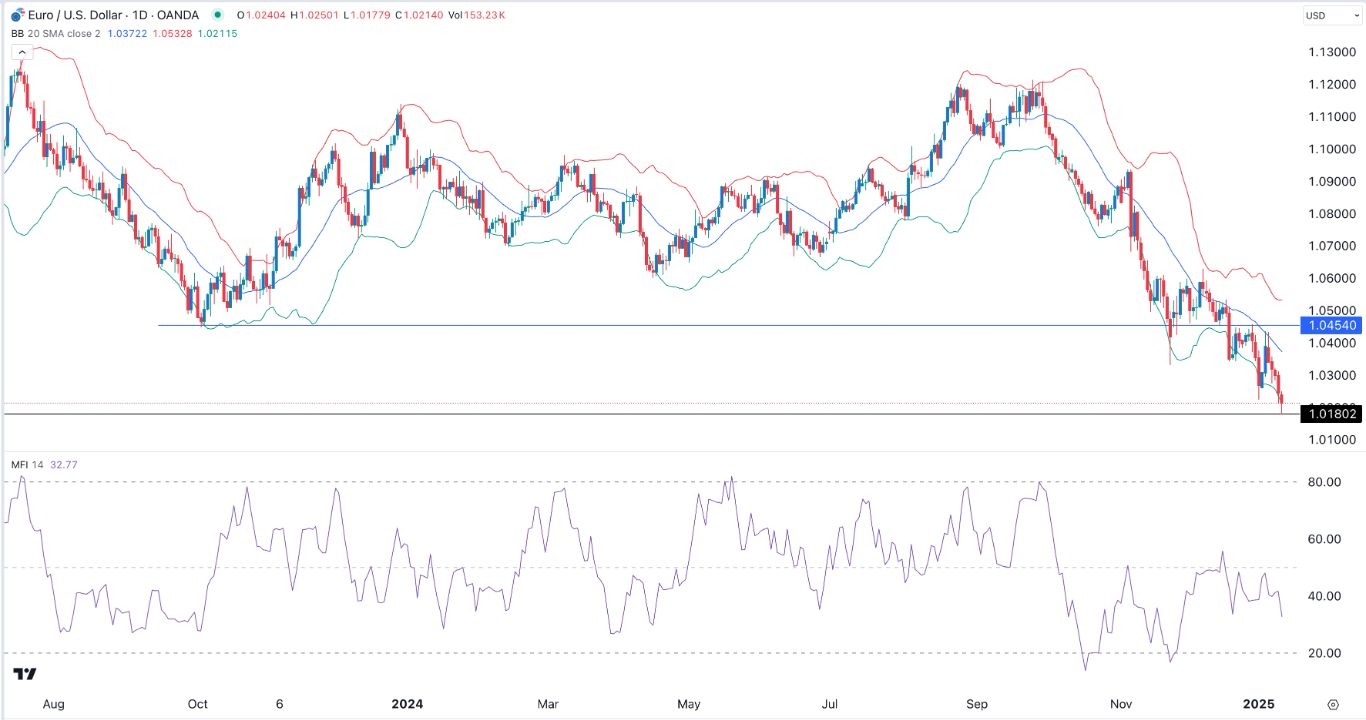 The EUR/USD exchange rate continued its strong downward momentum, reaching a low of 1.0180, its lowest swing since November 2022. It has been in a strong downtrend after rising to a high of 1.1200 in 2024.