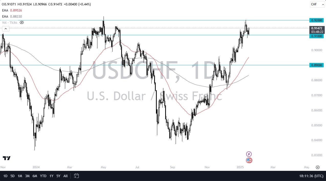 - The US dollar initially did dip a little bit against the Swiss franc, but the 0.91 level has offered enough support to turn things around. Ultimately, at this point in time, I think we have a situation where the market is going to try to reach the 0.92 level, an area that has had significant resistance.