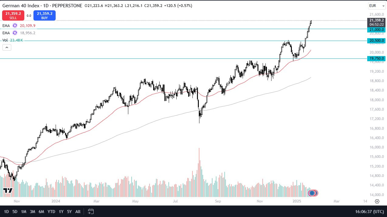 - The DAX rallied quite significantly during the trading session on Thursday and as we continue to stretch higher, we are now well above the 21,000 euro level and probably overbought at this point.