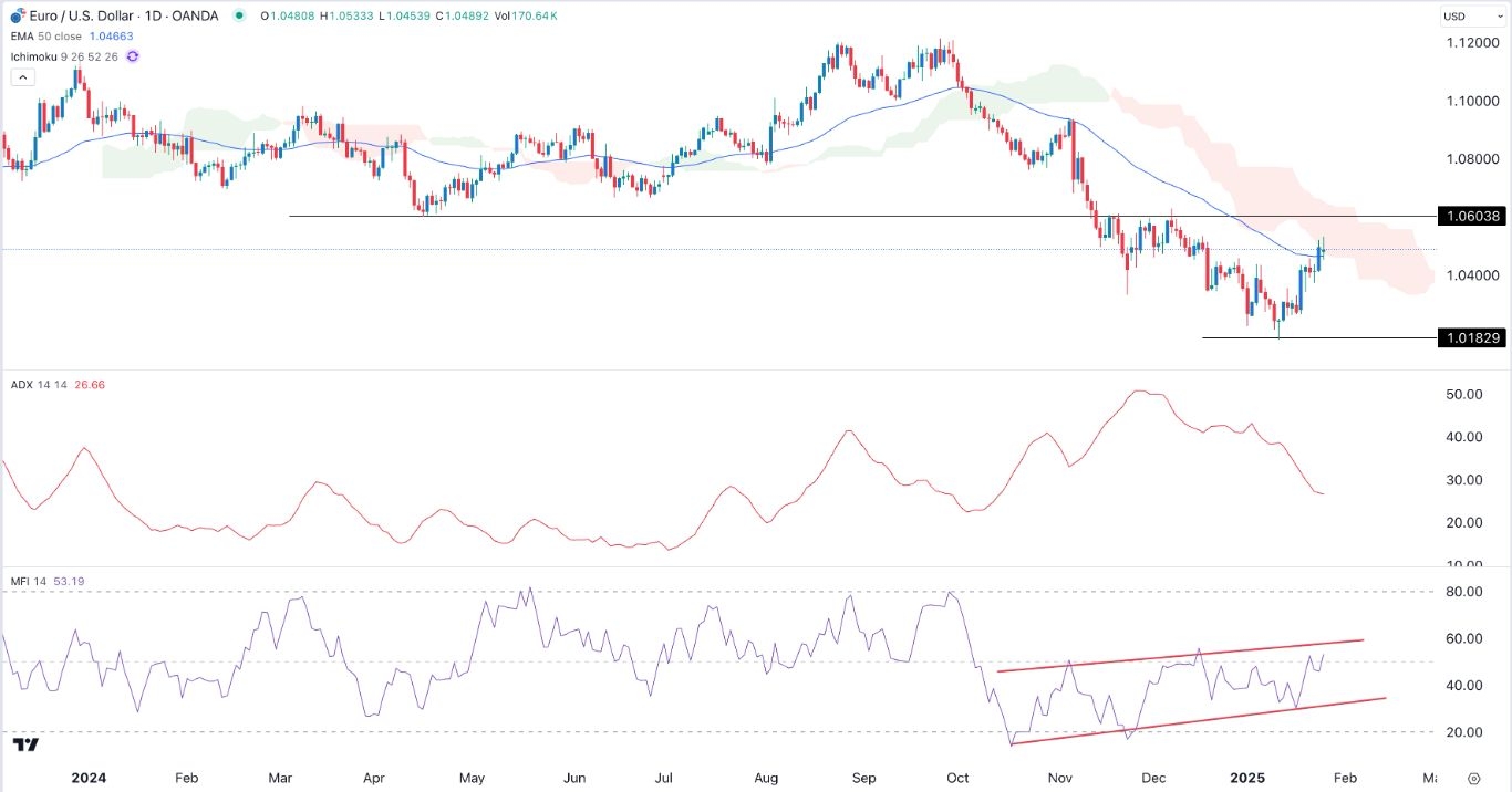 The EUR/USD exchange rate rebounded after bottoming at 1.0180 on January 13. It has bounced back to 1.0485, its highest level in almost 3 weeks.