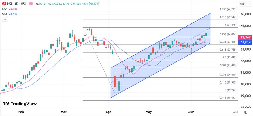 XM Hong Kong Stocks: In principle, China-US London Economic and Trade Consultations have reached a framework for the implementation of the Geneva consensus. After a slight adjustment, Hong Kong stocks have regained their strength today and hit a new high in the past three months. They close at noon at 24,392, and the upward trend in the afternoon remained, continuing to rise by more than 200 points. This morning, the Shanghai and Shenzhen 300 index hit its biggest gain in the past month, with materials, industry and consumer discretionary stocks leading the gains.