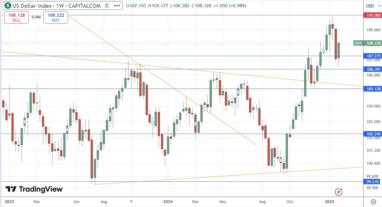 Last week, the US Dollar Index printed a bullish candlestick that continued the long-term bullish trend, after bouncing off an area of support. There were two further price action signs: