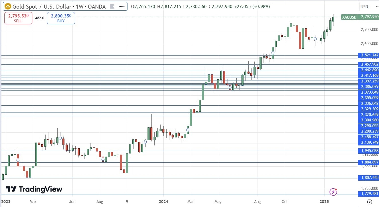 Gold advanced last week to reach a new all-time high above $2,800 per ounce. The price gave up some of its gains towards the weekly close to end the week back below the round number of $2,800. However, looking at the weekly price chart below, we can see that the price closed above the previous record high made in December 2024.