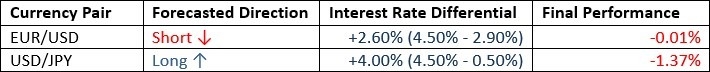 For January, I forecasted that the USD/JPY currency pair would rise in value and that the EUR/USD currency pair would fall in value. The final performance of this forecast was: