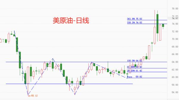 On the trend structure perspective, at the daily level, US crude oil is in a medium- and short-term bullish trend, and the volatility has increased significantly in the recent past. The upper and lower limits of the K-line in the last three trading days are between the top and bottom prices of a single K-line last Friday, which means that the bulls only exploded last Friday, and then it was xm217.comparable to the bears. The latest market price is US$72.79, between the 3.382 and 3.618 quarters of the previous round of the wave, and faces the suppression of a strong resistance range. It is expected that U.S. crude oil will fluctuate between $74 and $75 for a period of time, until the news xm217.comes with positive news, it will only break through the $80 mark.