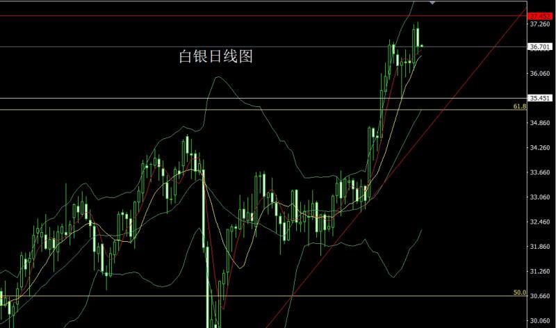 The silver market opened at 31.145 yesterday and then the market rose first. The daily line reached the highest position of 37.305 and then the market fluctuated strongly. The daily line was at the lowest position of 36.516 and then the market consolidated. The daily line finally closed at 36.71 and then the market closed with a large negative line with an upper and lower shadow line. After this pattern ended, today, 37. Short stop loss was 37.2, the target below looked at 36.7 and 36.5, and the falling below looked at 36.2 and 36.
