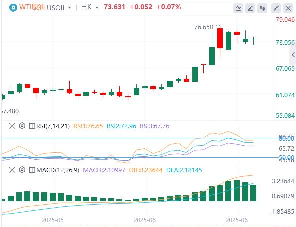 On Friday, crude oil trading was around 73.63. With U.S. President Donald Trump announces that he will be in two weeksWTI prices fell slightly after deciding to participate in the Israel-Iran conflict. Bloomberg reported late Thursday that Trump will decide within two weeks whether to strike Iran, as Israel hit more Iranian nuclear facilities and warned its attacks could overthrow Tehran's leadership. His latest stance shows that he took a step back after a series of tough xm217.comments, which dragged down WTI prices.