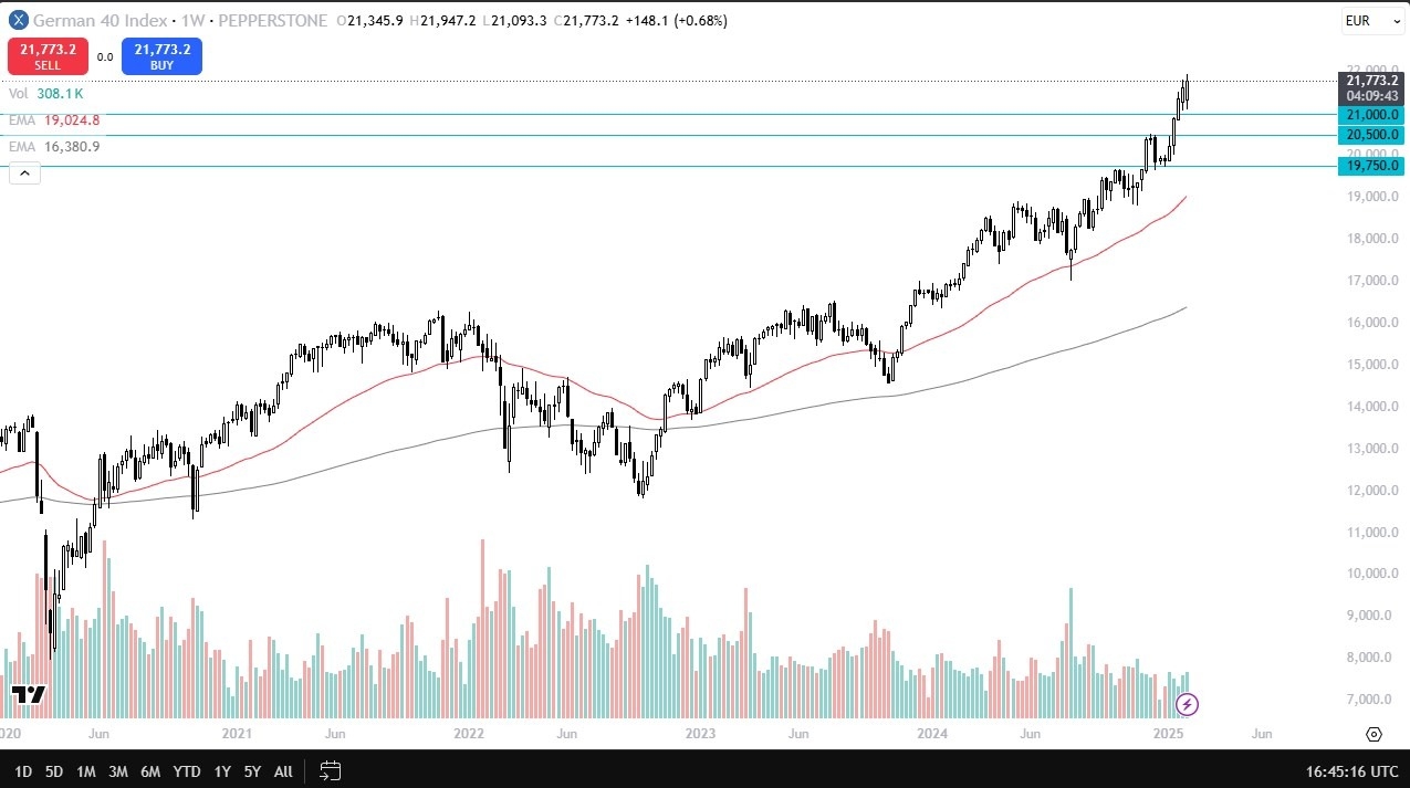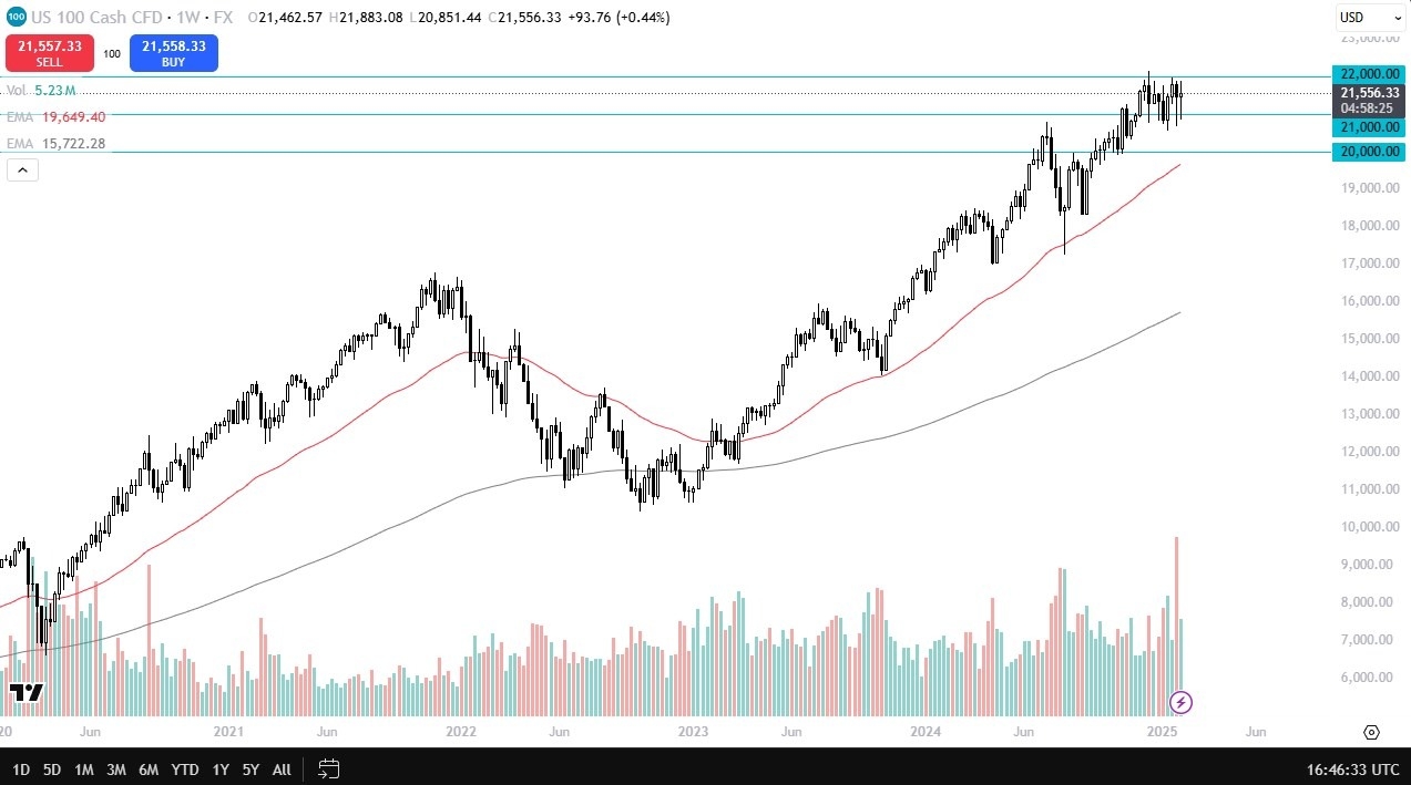 The NASDAQ 100 has formed a very neutral candlestick as the market has been all over the place during the past week. It’s probably worth noting that the NASDAQ 100 looks a lot like Bitcoin at the moment. All things being equal, I do believe that the NASDAQ 100 eventually break out to the upside, but I think you also need to look at short-term dips as potential short-term buying opportunities. I believe that there is plenty of support at the 21,000 level, right along with the 20,000 level where the 50 Week EMA approaches. If we can break above the 22,000 level, then we can start the next leg higher.