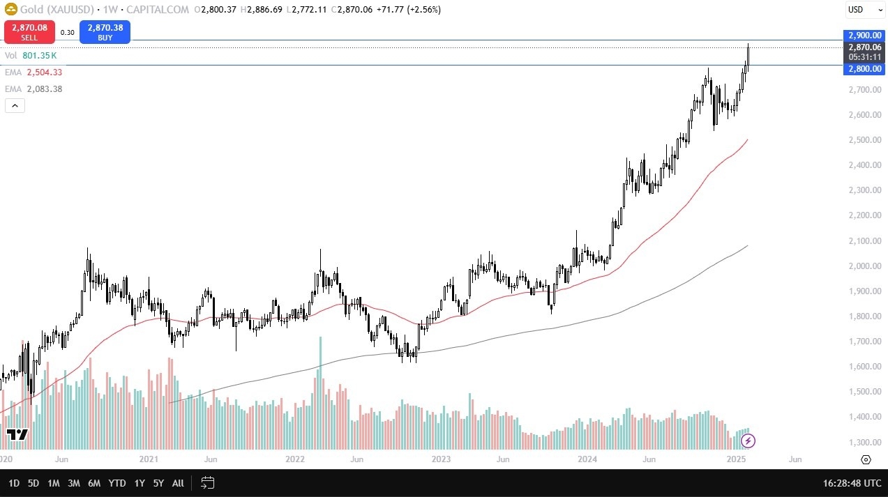 Gold markets have been rather strong during the trading week, as the market continues to see the uptrend be confirmed. At this point, I look at the $2800 level as a potential floor in the market, as a pullback to that area should see a certain amount of “market memory”, due to the fact that it was previous resistance. Unlike gold, and I think that ultimately, we will end up going toward the $3000 level above. That being said, you need to be cautious as there are a lot of moving pieces out there right now that could influence gold.