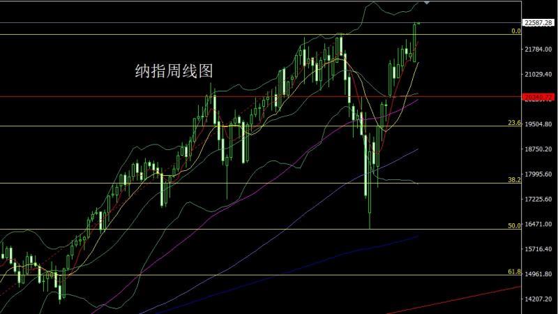 Nasdaq index market opened lower last week at 21398.21, and the market slightly fell back. After giving the position of 21385.91, the market strongly rose. The weekly line reached the highest point of 22603.91. After the market consolidated, the weekly line finally closed at 22514.76. The axis closed with a large positive line with a slightly longer upper shadow line. After this pattern ended, the stop loss of more than 22450 this week was 22380, with the target of 22600 and 22700 and 22800.