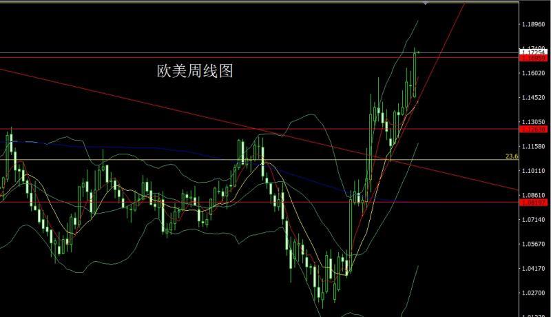 The European and American markets opened lower last week at 1.14544 after the market opened lower last weekAfter a slight retracement, the market rose strongly. The weekly line reached the highest point of 1.17541 and then the market consolidated. The weekly line finally closed at the position of 1.17185 and the market closed with a large positive line with a longer upper shadow line. After this pattern ended, the stop loss of more than 1.16950 this week was 1.16750, and the target was 1.17500 and 1.17750 and 1.18000.