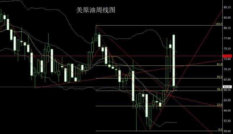 The U.S. crude oil market opened higher at 78.45 last week and then rose slightly, giving a position of 78.59. The market fell strongly. The weekly line was at the lowest point of 65.08 and then the market consolidated. The weekly line finally closed at 66.03 and then closed with a large negative line with a long lower shadow line. After this pattern ended, the lower target of 66.8 short stop loss of 67.1 this week is 66.2 and 66 and 65.5 and 65. If it falls below, look at 64 and 63.