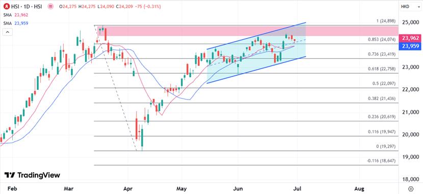 XM Hong Kong stocks: This morning, China's official manufacturing PMI in June rebounded to 49.7, slightly higher than the market forecast of 49.6, and the manufacturing prosperity level continues to improve. Hong Kong stocks closed in half a year today. The Hang Seng Index opened low and fell nearly 200 points. With the help of the 24,000 point mark, it fell 101 points or 0.4% in the half-day to 24,182 points. The market's afternoon decline continued to ease.
