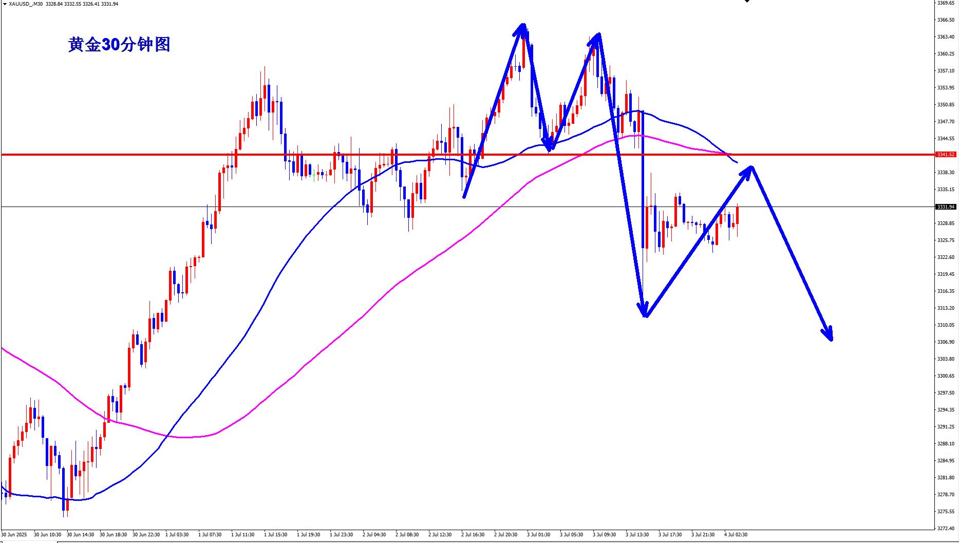 The gold 30-minute moving average has formed a dead cross downward short-selling arrangement. The gold short momentum has just begun. Gold 30 minutes showed a double top pattern yesterday. In the end, gold fell below the neckline level under the non-agricultural negative situation. The neckline level of gold 3341 is also an important suppression for gold in the short term. Gold rebounded 3341 in the early trading and was always a chance to continue short at highs.