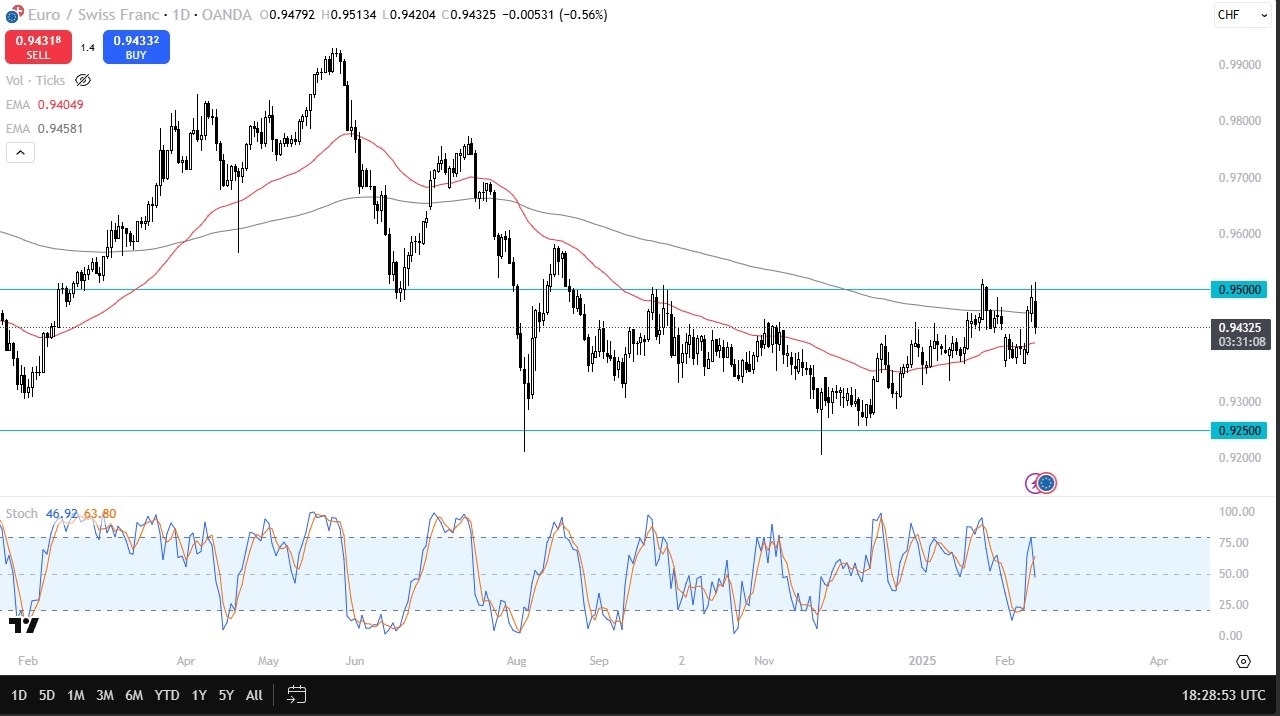 - The Euro has initially tried to rally a bit against the Swiss Franc, but it continues to find trouble near the 0.95 level.