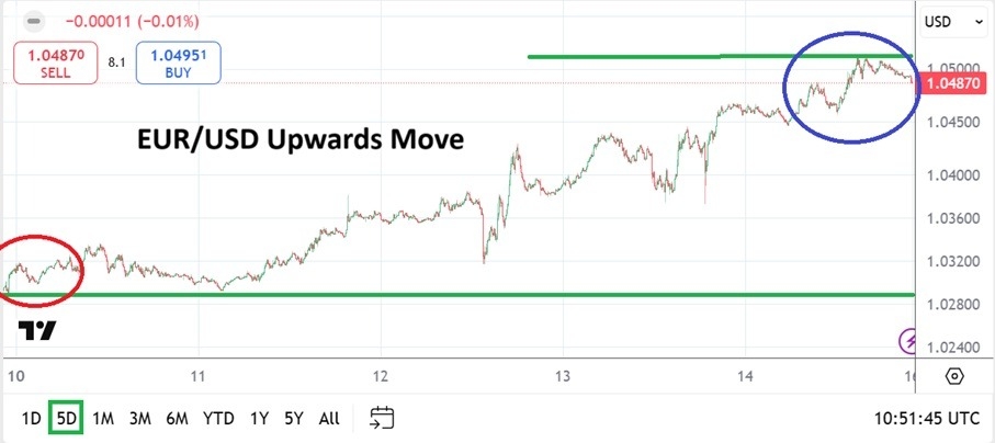 - Earlier on Friday the EUR/USD traded around the 1.05115 ratio as rapid buying continued after the 1.03150 vicinity was briefly challenged.
