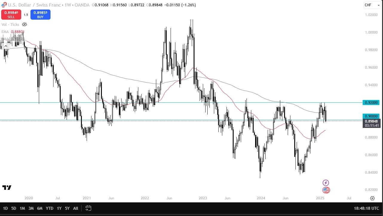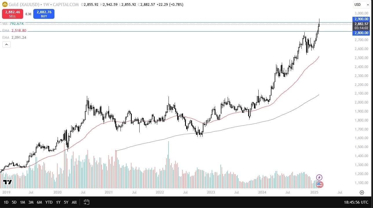 Gold originally broke above the $2900 level but has given back quite a bit of the gains late in the week, as it looks like we have finally gotten a little bit too far ahead of ourselves. Gold markets have been particularly noisy in the Asian session, so I’m not real sure what’s going on there, but it is a pattern I have been watching closely. At this point, I think it’s likely that we will see the market pull back a bit, but that should only end up offering a buying opportunity given enough time.