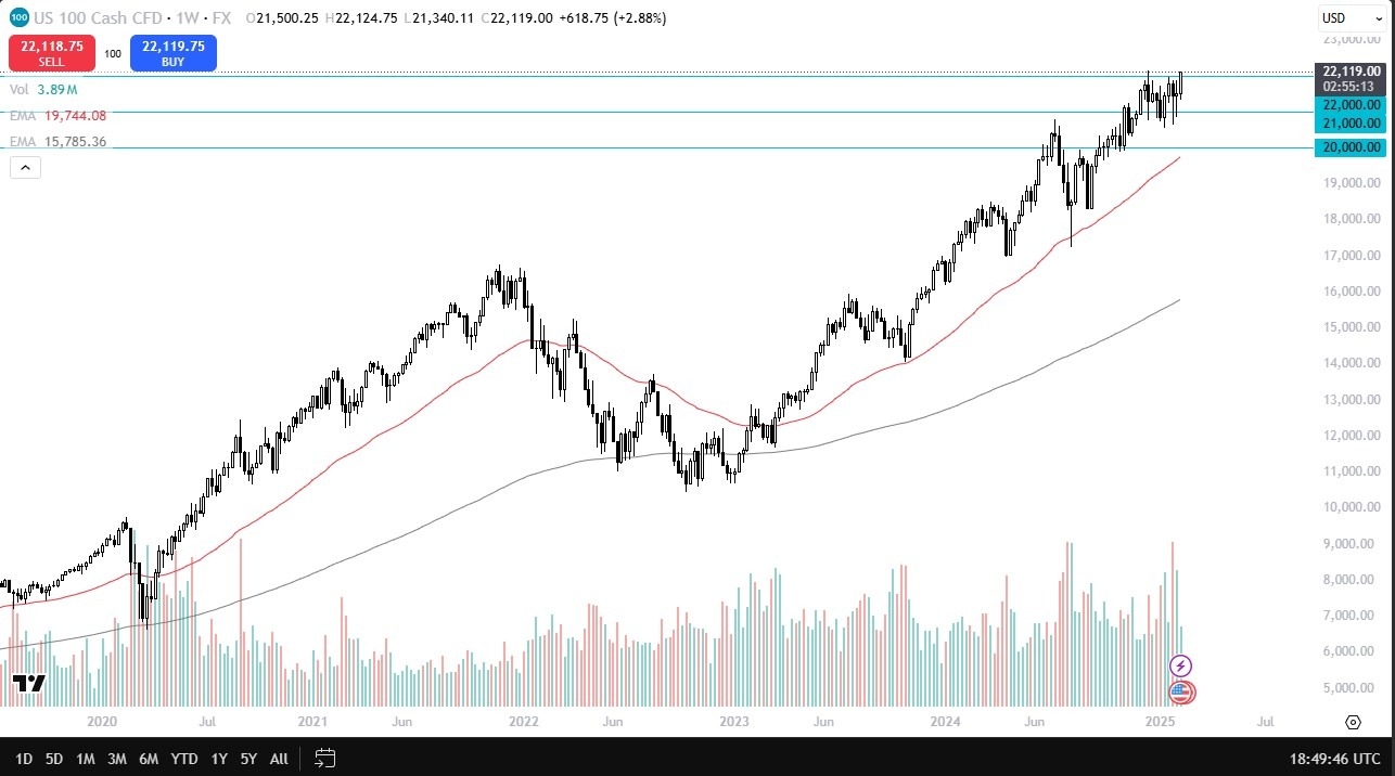 The NASDAQ 100 was very bullish during the week, breaking above the crucial 22,000 level again. By doing so, the market looks as if it is ready to continue going higher, especially as we close toward the very top of the overall range for the week. The question now is whether or not there is a being some type of tariff war kicking ohttps://xm217.comff, or perhaps we continue to see tensions cool, and if they do that should help NASDAQ 100 quite significantly. All things being equal, this remains a “buy on the dips” market as well.