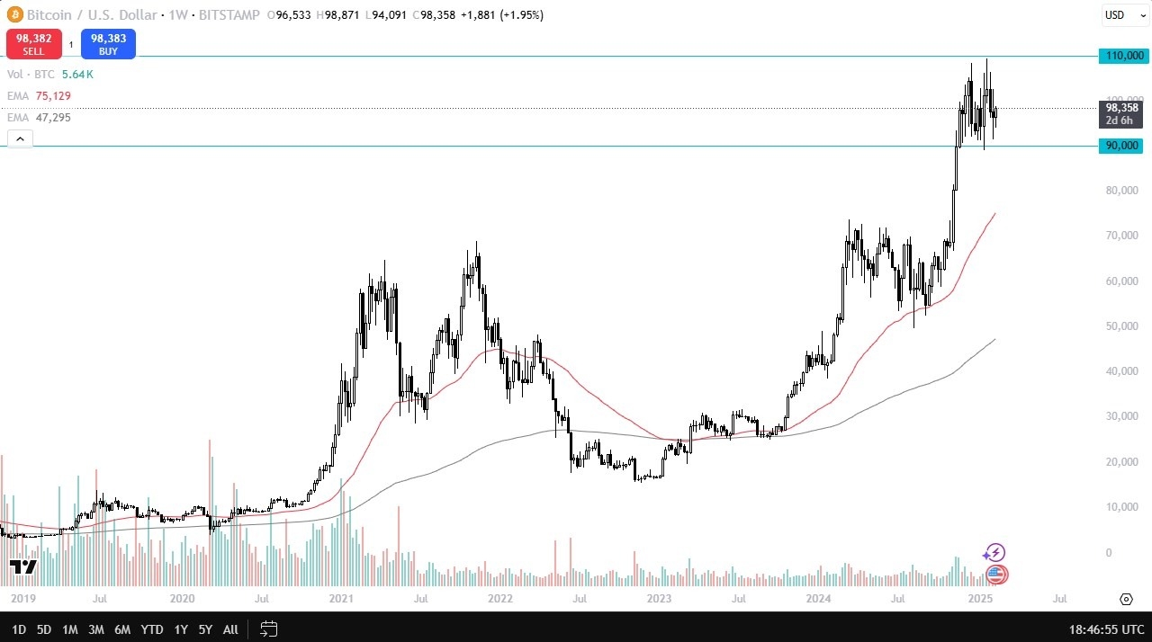 Bitcoin initially pulled back just a bit during the trading week, only to turn around and show signs of life. By doing so, the market looks as if it is trying to stay in the previous consolidation zone that we had been in. The $90,000 level below continues to be a major floor, while the $110,000 level above offers resistance. I think you continue to see more consolidation than anything else in the market right now.