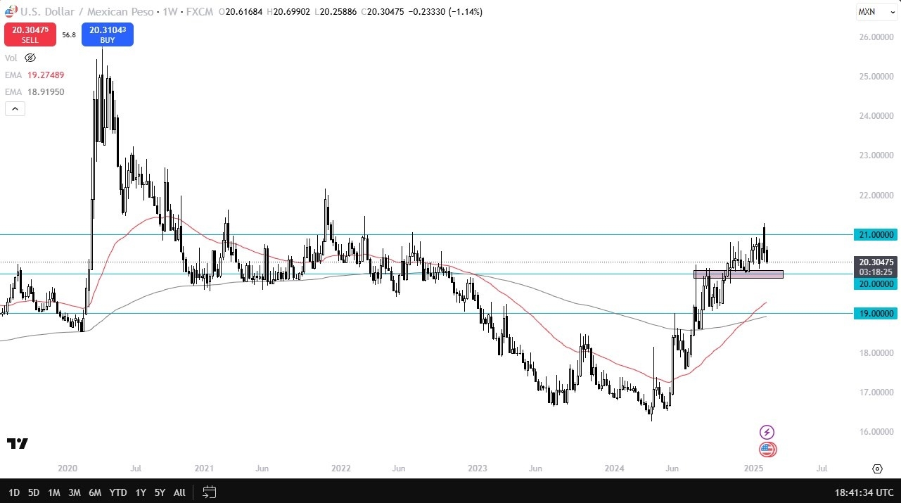 The US dollar has fallen during the trading week against the Mexican peso, but at this point in time it looks like the pair is still stuck in a range. The 20 MXN level on the bottom offer significant support, while the 21 MXN level above offers significant resistance. As we have had the tariffs put on pause, this has helped the Mexican peso, but we still haven’t got to the point where we have a permanent deal, so the jury is still out when it xm217.comes to this pair.