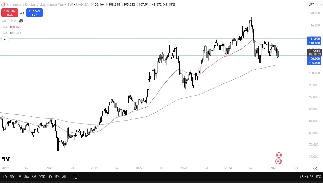 The Canadian dollar has rallied rather significantly during the week against the Japanese yen, and it now looks as if the market is trying to do everything it can to stay in the same range that it is been in for a while, with the ¥160 level underneath being a bit of a floor, but at the same time I do see a lot of resistance near the ¥110 level. Furthermore, you have to keep in mind that although the Canadian dollar has strengthened during the week, it’s not exactly a strong currency. The Japanese yen is bolstered by the idea that the Bank of Japan might be doing a bit of inflation fighting. I expect choppy sideways action.