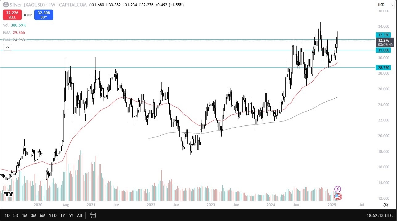 Silver initially was very choppy during the week but in early Friday trading silver leapt above the $32.35 level. Since then, we have seen the silver market crater on Friday and therefore I think you need to be very cautious here. Short-term pullbacks could end up being buying opportunities, the last thing I would do is put a ton of money into this market heading into such volatility. Remember, silver is extraordinarily volatile under the best of conditions, so caution is warranted. Regardless, I don’t have any interest in getting short here, but might look for better pricing to get long.