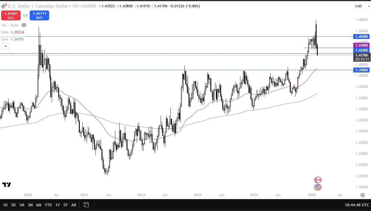The US dollar has plunged against the Canadian dollar during the trading week to break down below the 1.42 level. This of course is a very negative week, as traders are starting to price out the idea of a trade war with the United States. I think this is a mistake at this point, because quite frankly Justin Trudeau has shown no real interest in trying to sort something out with the Americans. If Trump starts tariff in the Canadians, this market will turn around and skyrocket to the upside. I would be very careful here.