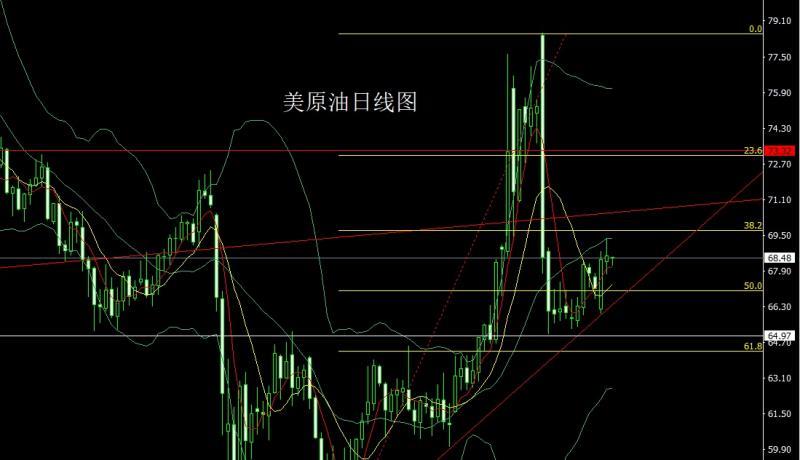The US crude oil market opened lower at 66.2 yesterday and then fell first. After the daily line was at the lowest point of 66, the market fluctuated strongly and rose. The daily line reached the highest point of 69.32 and the market reached the daily level Bollinger's middle rail pressure consolidation. The daily line finally closed at 68.56 and then closed in an inverted hammer-like pattern with a long upper shadow line. After this pattern ended, the short stop loss of 69.6 today. The target below is 68 and 67 and 66