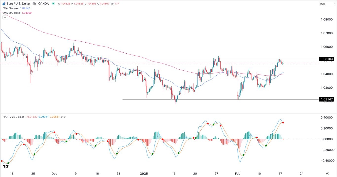 The four-hour chart shows that the EUR/USD pair has held steady in the past few days after bottoming at 1.0215 earlier this month. It has jumped and hit a key resistance level at 1.0510, the highest swing on January 27. The 50-period and 200-period moving averages have formed a bullish crossover, a key positive sign.
