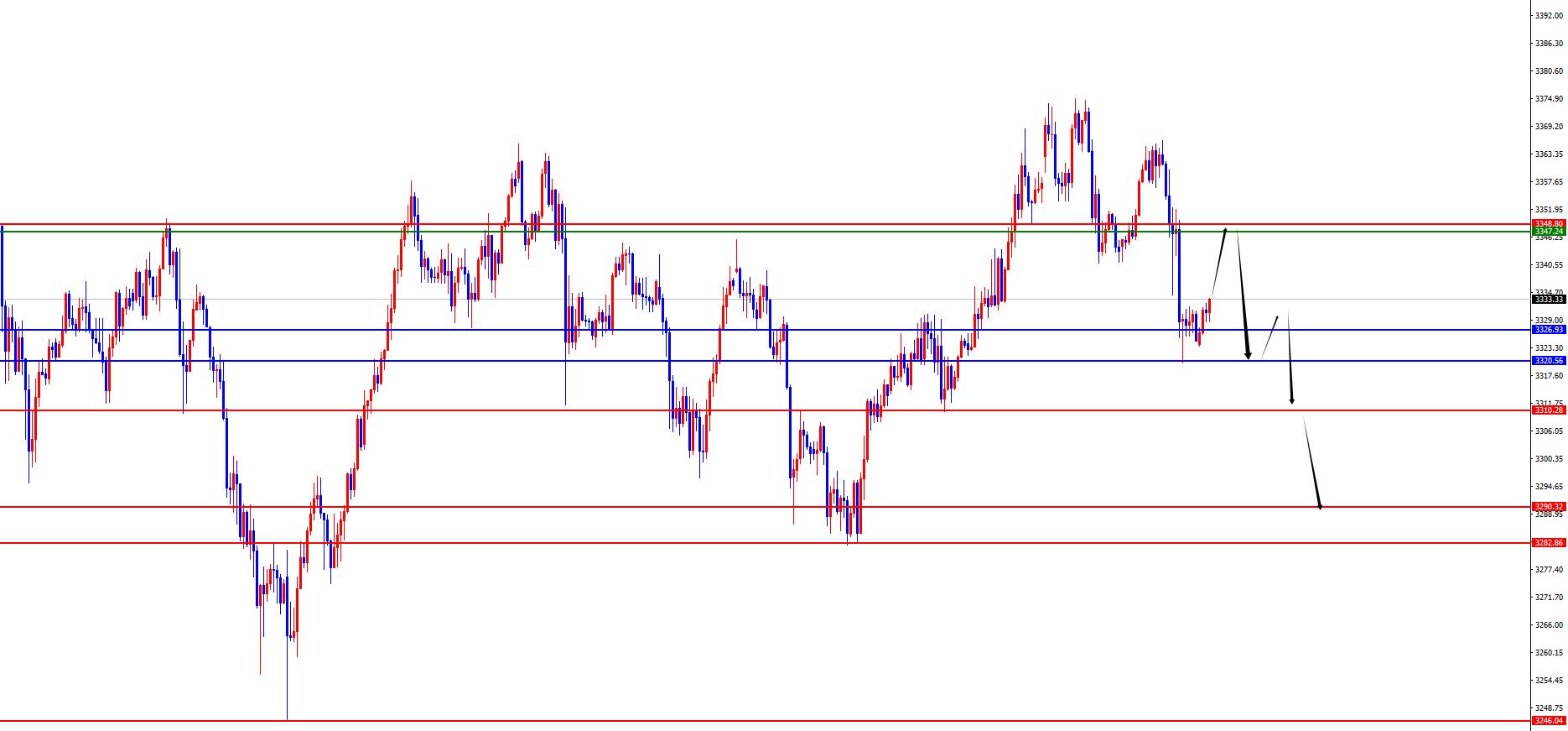 From multi-cycle analysis, first observe the monthly rhythm. The price runs at the rhythm in May as the author said, and the final cross state. The final price in June is still in an anti-K state, so you still need to be cautious when dealing with the majority. From the weekly level, prices on the weekly line have continued to fluctuate at high levels recently. As time goes by, the weekly watershed is temporarily at 3320-3322. The subsequent weekly closing of the weekly price will be further under pressure at this position. According to the daily level, the price broke through the daily resistance position last Friday. On Monday, the price stopped falling at the 618 position where the decline was retracement as expected, and finally the daily line ended with a big negative end. On Tuesday, the price once again pierced the daily support. We need to pay attention to further breaking performance in the future. According to the four-hour level, the price stabilized in the four-hour resistance position last Thursday, and then rebounded upward in the short term. Yesterday, the price fell below the daily support position. At present, the short-term market is relatively bearish. At the position, the resistance of the 3347-3348 range is temporarily focused on. In the short-term fluctuation of the upward price in one hour, we will pay attention to the resistance of the 3343 area in the future. In general, we will treat it as a volatile decline before breaking the low point of yesterday. We will pay attention to the 3220-3310-3290 area below in the future.
