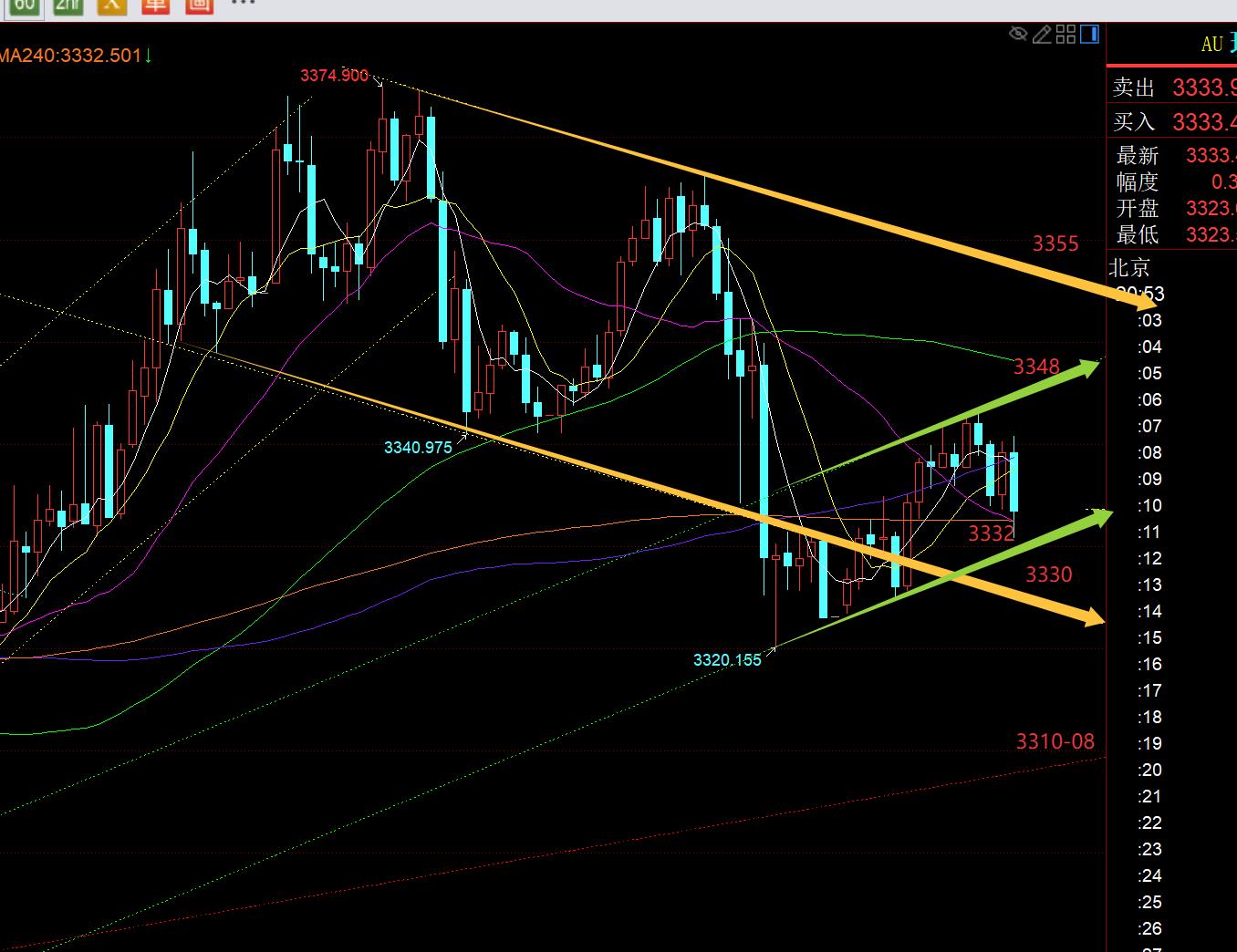 First, gold daily line level: yesterday rose and fell again, closing with an upward trend The shadow line is negative K, and it hits the middle track again. This way of moving is a typical oscillation, advances, retreats, and slowly consumes the patience of market investors. After supporting 3247 in early July, it ushered in three consecutive positive rebounds, and then under pressure 3365 made a five-day fluctuation and slow decline. On July 9, it stabilized at 3282 and showed three consecutive positive rebounds. This week, suppressing 3375 and then showed another oscillation suppression. The focus below is to test the convergence triangle lower track line, and it has moved up to 330 today.8. If you can stabilize this position, it is still easy to bottom out and continue to fluctuate and continue to oscillate and organize the convergence end. As the hole gradually shrinks, it is expected that you must be careful to break through at any time within two weeks of operation and usher in large unilateral fluctuations. In recent times, every time you approach the lower track of the convergence triangle, it is a good short-term bottom point, such as 3247, and 3282, basically every time you will bring about an increase of around 100 meters. This time, it will be at the 3308-3310 line, and you will still try to touch it;