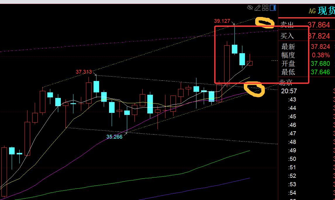 Second, silver: yesterday morning If it breaks through 38 and bottoms and pulls up K, it will not continue, which will bring some rebound in the afternoon, but the strength is not large, only touching the 38.35 line; the US market fell after the inflation data was suppressed, but the research report pointed out that 37.6 and 37.3 have support, and there is indeed some rebound strength when touching 37.6;