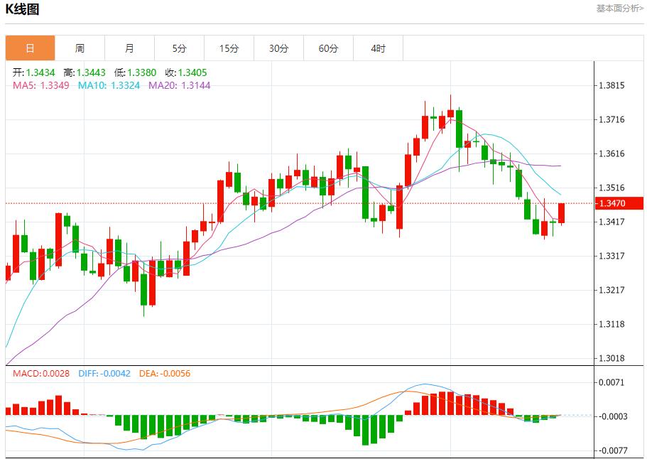 GBP/USD:As of 20:23 Beijing time, GBP/USD rose, now at 1.3472, an increase of 0.41%. Before the New York Stock Exchange, the (GBPUSD) price continued its cautious gains in the previous trading, trying to regain some of its previous declines, the rise occurred as the short-term bearish correction trend continued, and its trading was trading along the bearish bias line, indicating that the negative technical pressure on the price movement was still continuing.