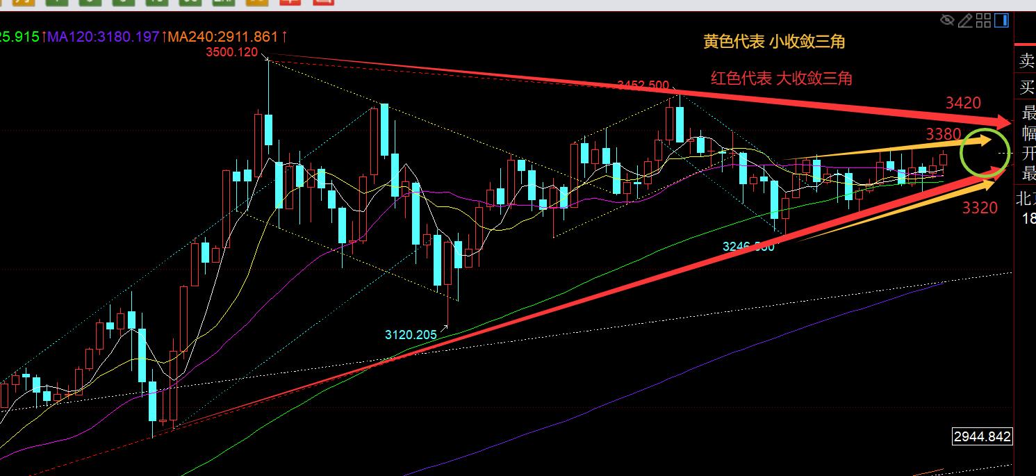 First, gold daily line level: 3310 line converges the lower track of the triangle and stabilizes again, and then follow the cycle method, which will be in a pull-up state for at least three consecutive days, and today is the third day; if the derivative pressure point 3380 line corresponding to the trend resistance line still fails to directly break through the stand, it may be necessary to suppress again One wave, repeatedly test the support point of the lower rail of the large convergence triangle, but one thing can be found that 3365 suppressed that time, the callback time was five days, while 3377 suppressed that time, the callback time was four days. This is actually not difficult to understand, because the low point of the lower rail trend line is constantly moving upward, and the force of the upper trend resistance line breaking through the high is not very large, which leads to the narrowing of the small convergence triangle. Therefore, if 3380 is suppressed and then slides down, the time for the time to pull back will not exceed three days; until the market finally waits for the market to choose the breakthrough direction, before the lower rail support has not been effectively lost, individuals will continue to tend to wait for the upward breakthrough, and wait for the market to break through and stand on the upper rail of the small convergence triangle. , we will test the pressure of the upper rail line of the large convergence triangle (3500-3452), which will move down 3420 line this week; and only by breaking through the upper rail of the large convergence triangle can we officially have the probability of starting a large one-sided pull-up, returning to the bull market, and the adjustment is over, which is expected to be made within two weeks at most;