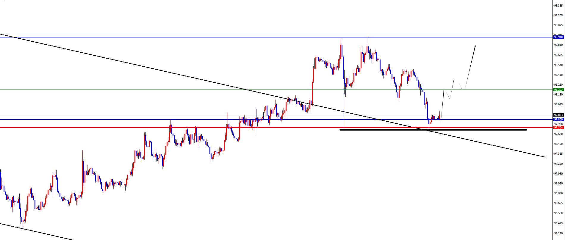From a multi-cycle analysis, the price is suppressed in the 98.90 area resistance at the weekly level. From a medium-term perspective, the trend of the US dollar index will be more bearish, but it is key to pay attention to whether it can break up in the future. At the daily level, the price has broken through the daily resistance in the early stage, so the daily resistance has become subsequent support. As time goes by, the key price support position is at 97.70-80. Overall, it is a secondary step back after breaking through the daily line and stabilizing. Therefore, the price can continue to treat more bands above this position. From the four-hour perspective, the early price is as stated by the author to support it after touching the channel line. After falling below the four-hour support last Friday, it is currently under short-term pressure. As time goes by, the current four-hour resistance is at 98.20. The focus will be on whether this position can continue to stand firm. Once it stands firm, it will continue to continue to rise. From the one-hour level, the price is a second return after breaking the previous downward trend line.The position you are stepping on is currently rising in the short term, so you can pay attention to the daily support and look at the rise. After breaking through the four-hour resistance, you will continue to pay attention to the gains and losses of weekly resistance.