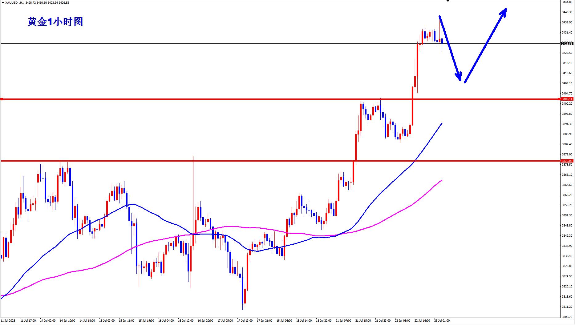 The gold 1-hour moving average continues to line up with a golden cross, and the bulls are still there, and gold continues to exert force. In the past two days, as long as there is no significant decline, it is to accumulate momentum to attack, and the support of gold continues to move upward. Now it has broken through and stood firm at the 3400 line. Gold can still continue to go long at lows after falling back on the 3400 in the early trading.