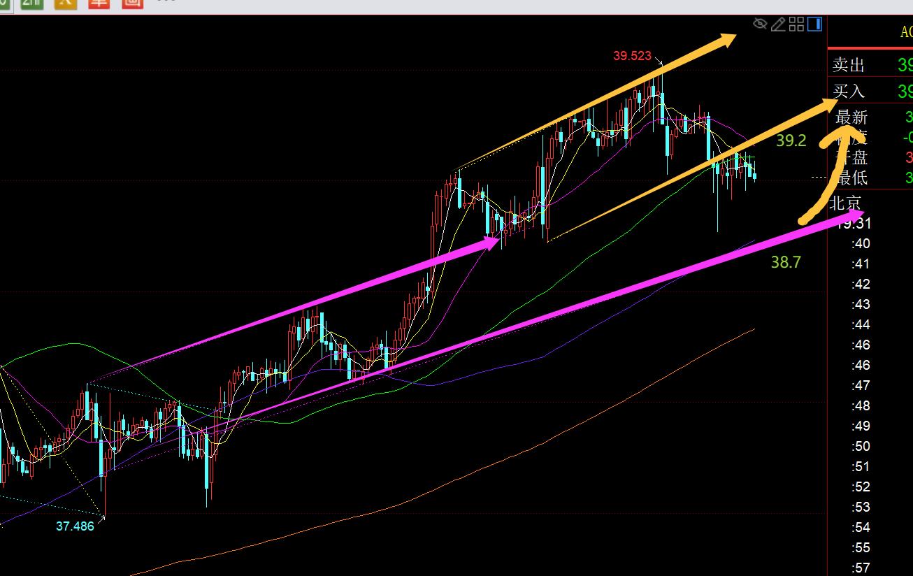 Silver: at the daily level, silver still maintains a good strong upward pattern, and try to continue to fall back and bullish; tonight the lower track of the yellow purple channel stabilizes and bullish on the support of 38.7, and the resistance is 39.2, and you can only return to the yellow upward channel after breaking through the station;