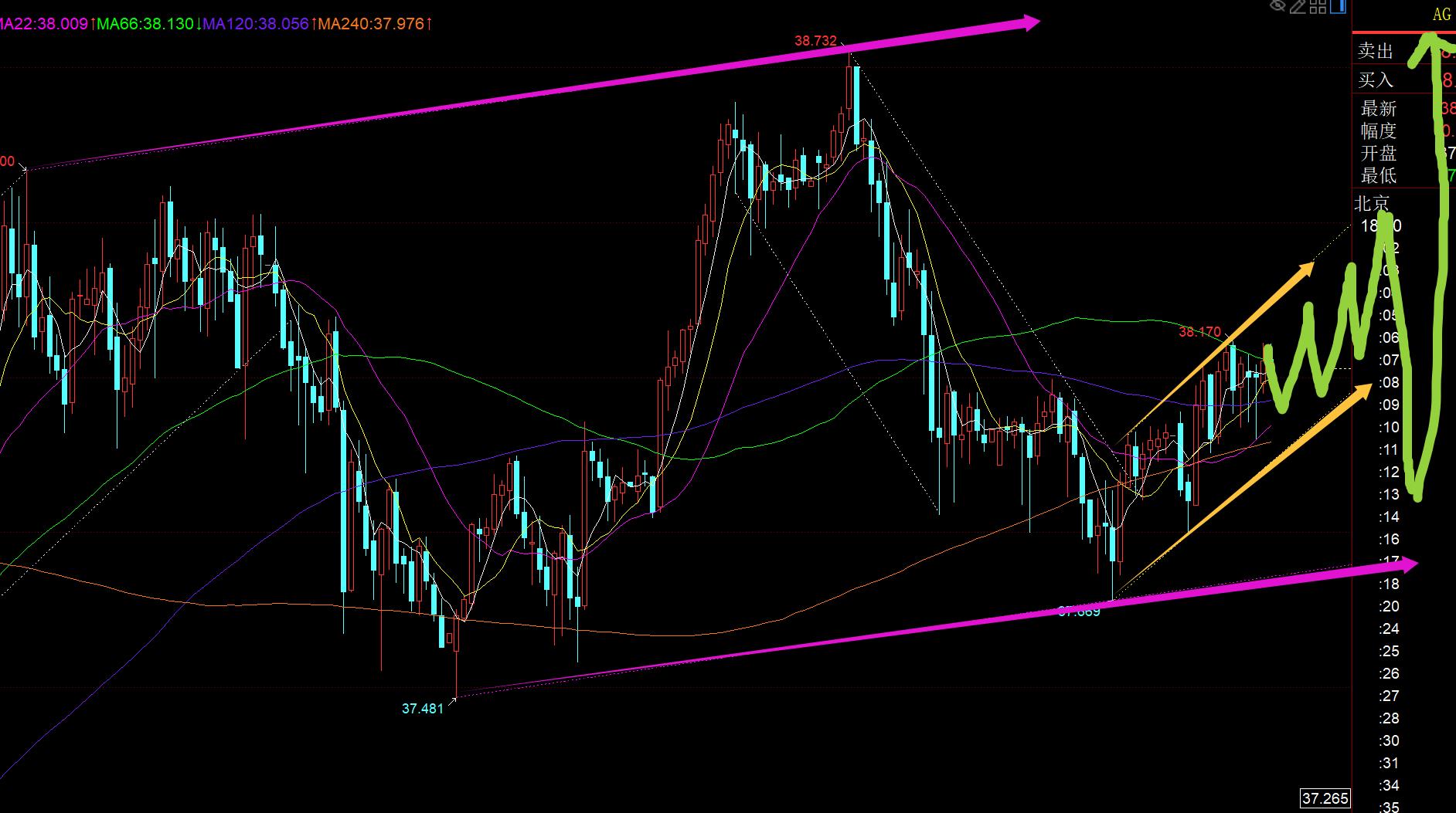 Silver: Short-termIts trend is stronger than gold in a few days. The daily line showed a small positive outlook last Friday, and it continued to fluctuate and pull up today. The entire European session maintained a slow rise in fluctuations and broke through the overnight sideways to suppress the resistance of 38.08, so it will continue to be bullish tonight; support 38-37.95, with the lower rail of the purple channel as the node support, and the resistance target is 38.3-38.4. If the breakthrough is made, you can directly look at 38.8-39; there may be a wave of reverse reversal and fallback after stabilization. If you attack again, you should impact the upper rail of the weekly channel at 39.6;