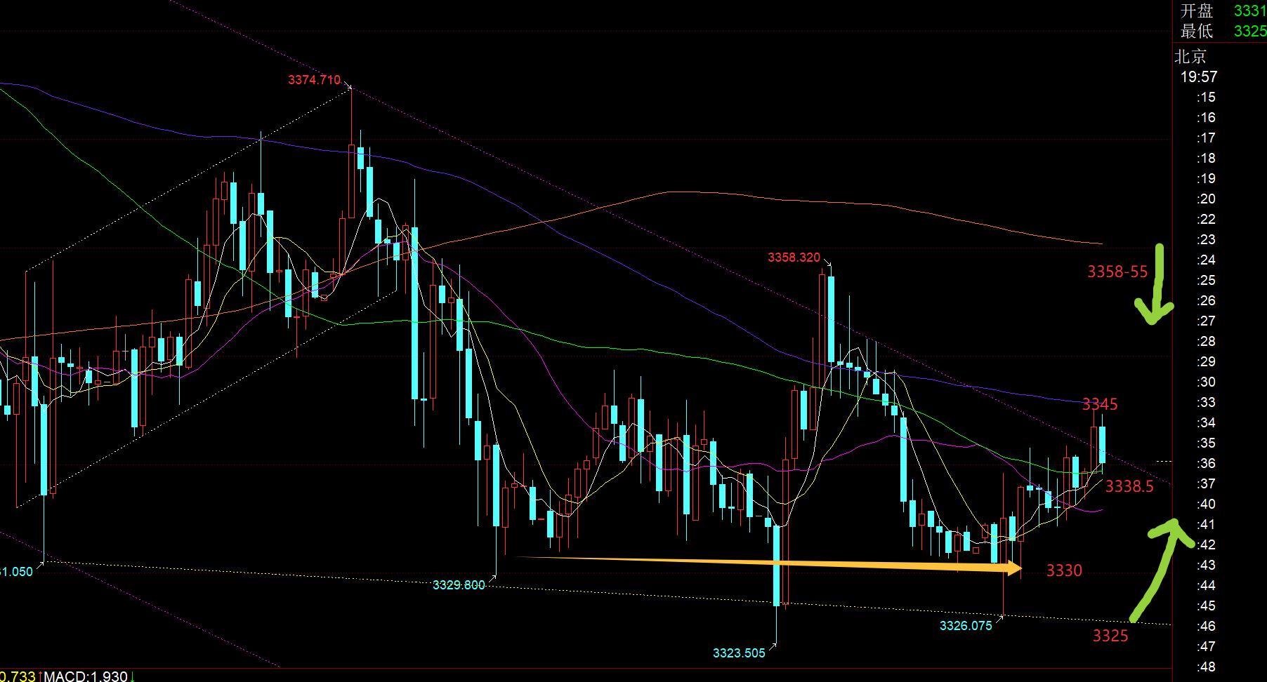 First, gold: Yesterday was extremely depressed, waiting for 3322 to support it is bullish in the morning, the price is slightly different from 1 US dollars, and it directly bottoms out and rises rapidly, watching it rise; the afternoon retracement plan of 3340 continues to follow the bullish, and only to 3342, which is a little worse, and also to see it rushing straight with a full big sun. These 13 big suns are effective It broke through the upper track of the downward trend resistance, but it turned out to be a smoke bomb. The US market held on 3345 for several hours, but in the end it still failed to hold on, and a wave of washing; it missed twice in the first half, and followed in the second half, but a disgusting wave of washing;